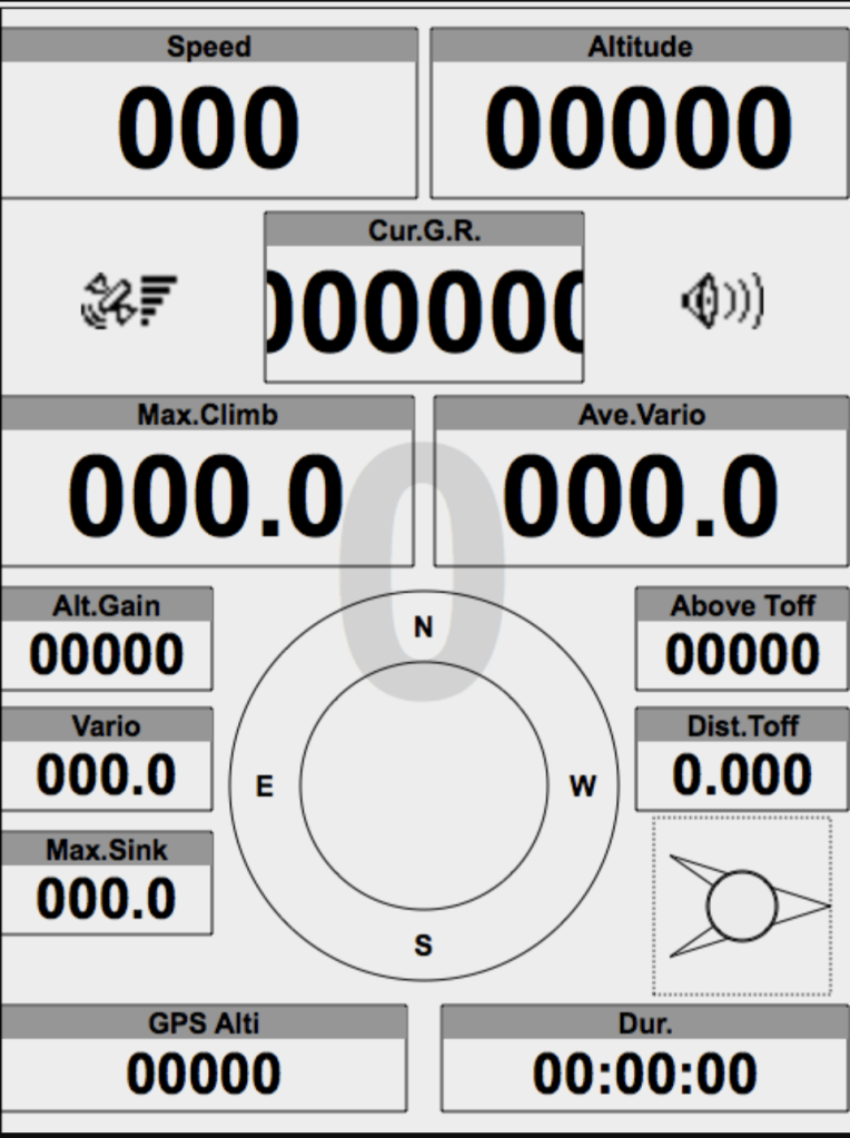 • Current glide ratio: glijgetal, die wordt berekend op basis van je grondsnelheid en average vario.