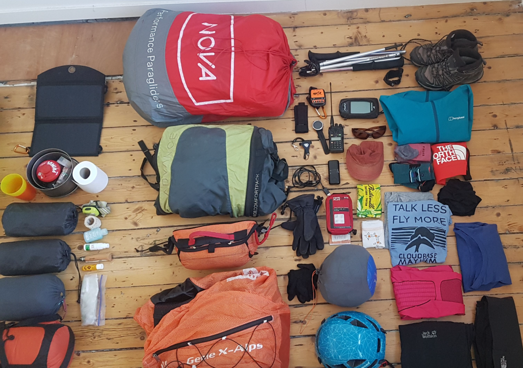 • Fijne dingen om toch mee te nemen: wandelstokken, sporttape, first aid kitje, parapentereparatiekitje (ripstop, lijnen, naald en draad,..), zonnebrandcrème, tampons (als makkelijke firestarter).