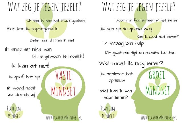 Psychologie Carol Dweck maakt een onderscheid tussen twee mindsets: de groeimindset en de vaste mindset. Die bepalen de mate waarin je gelooft dat je talenten en vaardigheden vast staan. Welke mindset je hebt, heeft veel invloed op je leerhouding. Meer info over de groeimindset: